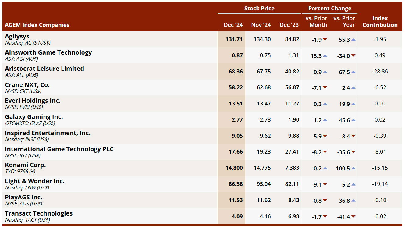 The Association of Gaming Equipment Manufacturers (AGEM) has announced the latest results for its Index, encompassing the month of December, which show a decrease of 79.54 points to 1,564.82 points, or by 4.8%, as compared to the prior month. Compared to one year ago, the index was up 446.00 points,