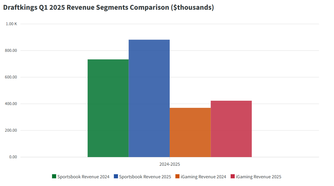 DraftKings 公布其 2025 年第一季度營收為 14.1 億美元,較 2024 年第一季度的 11.8 億美元同比增長 20%。該公司指出,其體育博彩和 iGaming 產品的參與度很高,持有率有所提高,並且其於 2024 年 5 月收購的 Jackpocket 也得到了持續整合。